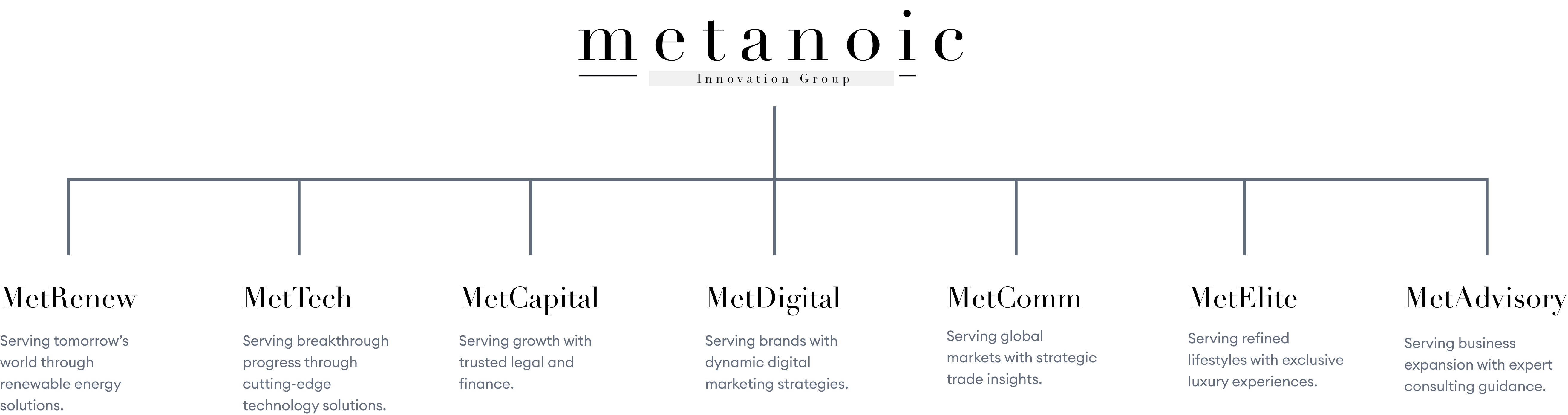 Our Metanoic Innovation Group (MIG) brands work in synergy to deliver exceptional innovation and unmatched excellence across diverse industries. Leveraging an expansive network of esteemed partners, we empower businesses, consumers, and institutions globally. Our unified, collaborative approach sets new benchmarks in renewable energy, technology, finance, and beyond, driving sustainable progress and transformative growth for a better future.
